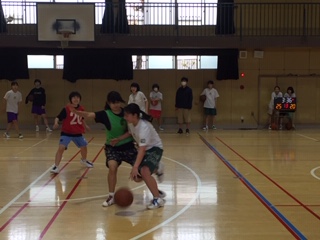 体育館では、午後、女子バスケットボール部が、卒業した3年生と試合をしています。