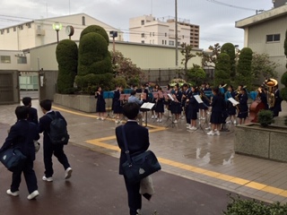 ※写真は、昨日の新入生仮入部が終了して、下校時(17時)に吹奏楽部が正門付近で歓迎の演奏を披露してくれた様子です。