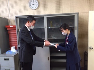 ●放送集会で学級役員の認証式が行われ、代表で3年生の学級委員長に認証状が手渡されました。