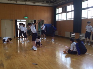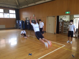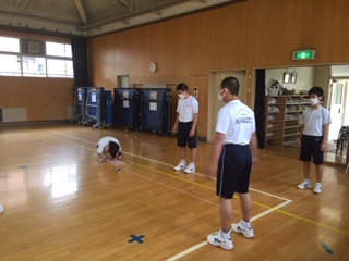 3年生の体育では、男子は格技室で、新体力テストの「立ち幅跳び」を行っています。