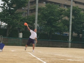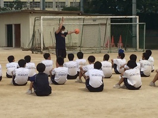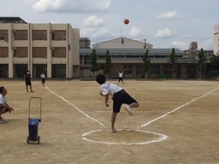 3年生の男子体育で、新体力テストの「ハンドボール投げ」を実施しています。