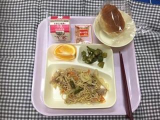 本日の給食は、和風焼きそば、オクラの甘酢あえ、オレンジでした。