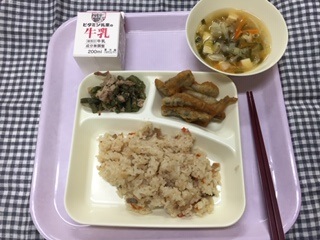 給食の主食に「かやくご飯」が初めてのメニューとして登場しました。