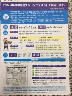 昨日お知らせしました、「チャレンジテスト」のリーフレットですが、1年生は初めてですので、学年・学級で生徒に説明したうえで、後日配布いたします。(1学期中予定です)