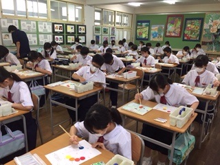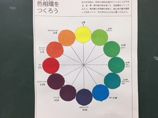 1年生の美術では、ポスターカラーを使用して、色相環を作成しています。