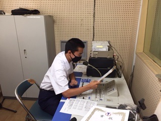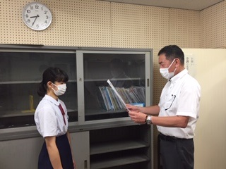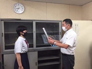 土日の部活動の大会についてのお話と、剣道部の個人戦で大阪府3位の表彰が行われました。表彰を受けた剣道部の女子2名は8月の近畿大会に出場します。頑張ってください。