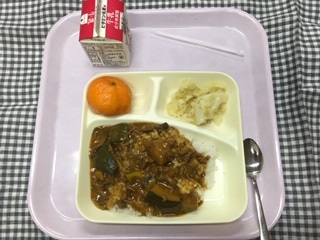 ●本日の給食は、夏野菜のカレーライス・キャベツのサラダ・冷凍みかんでした。