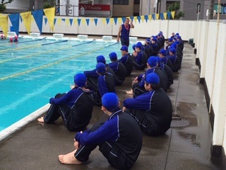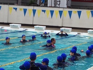 1年生の水泳の授業で体操服を着てプールに入っています。