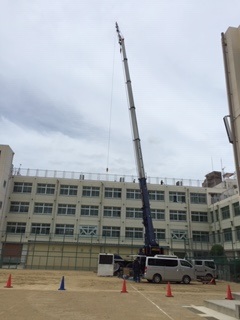 西館校舎のエアコンの入れ替え工事で、屋上の室外機の入れ替えをするのに大型クレーン車が運動場に入り、屋上へ室外機を吊り下げての設置をしています。