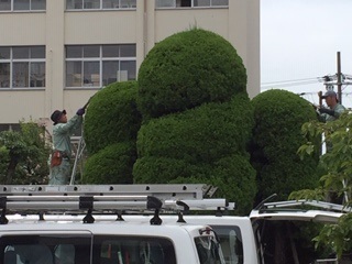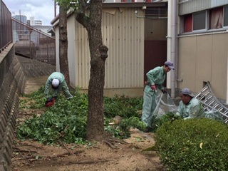 本日より、管理作業員の園芸作業の方々に来ていただき、樹木の剪定をしていただいています。