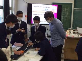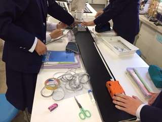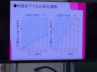 運動とエネルギーの学習で、斜面を下りる台車にテープを貼り、0.1秒毎の進んだ距離を記録タイマーで計測する実験を、斜面の角度を変えて行なっていました。