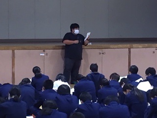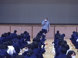 1年生が7時間目に体育館で、校外学習の事前指導をしていました。