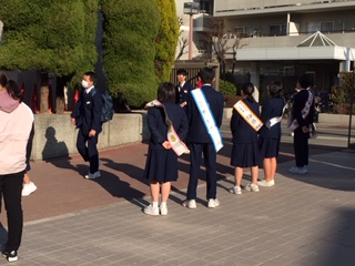 生徒会立会演説会を放送で行うため、立候補者が顔を覚えてもらうためにも、登校時にあいさつ運動をしています。