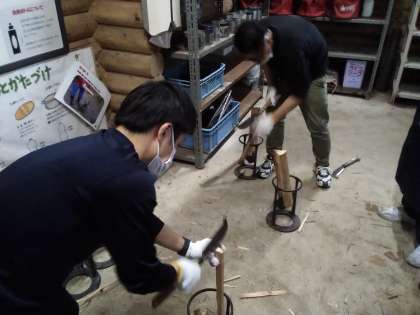 火をおこしやすいように、先生方で薪わりです。