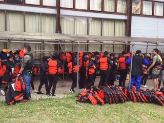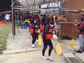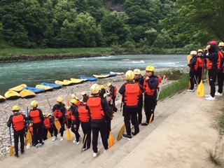 ウエットスーツに着替えラフティングの準備をしています。