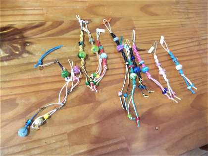 とんぼ玉作り ブレスレットかキーホルダーを選んでいます。