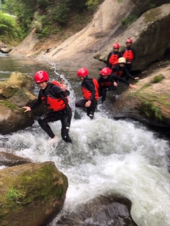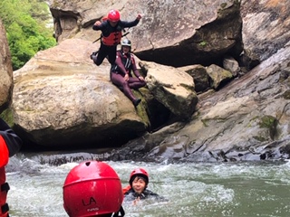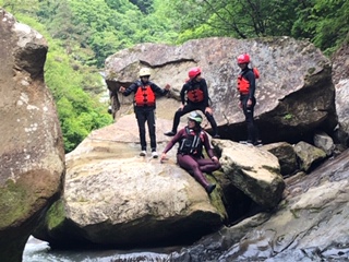 ウエットスーツにライフジャケット姿で川を歩いて行きます。