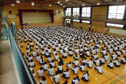 ハンカチで鼻と口を押え、体育館にクラスごとに整列しました。