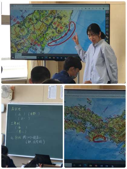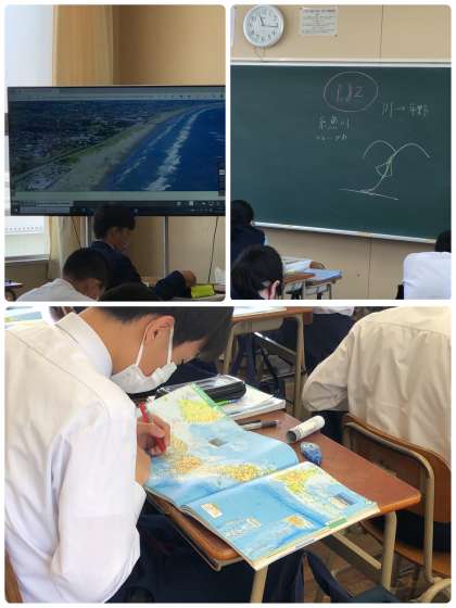 リアス海岸と出来事(東日本大震災や世界遺産登録)や産業(地形により波が穏やかになり養殖業がさかん)と関連付けて知識と学びを深めていきます。