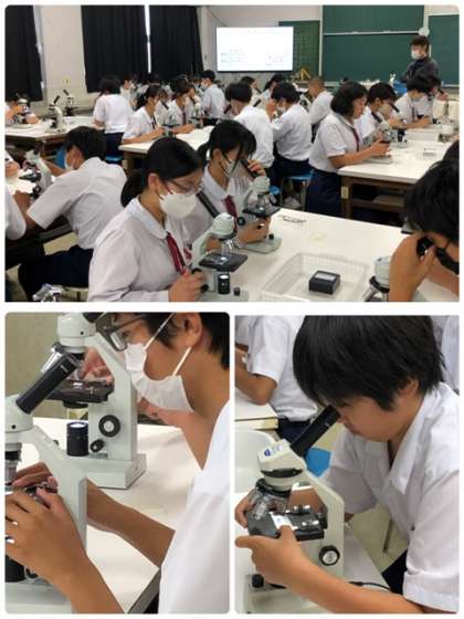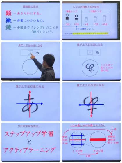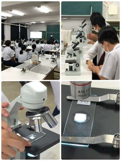 本時はその顕微鏡の機能すべてを使いこなす授業でした。大久保先生の説明をしっかりと聞いています。見事な「ステップアップ授業」により、一人ひとり全員が着実に操作方法を身につけました。