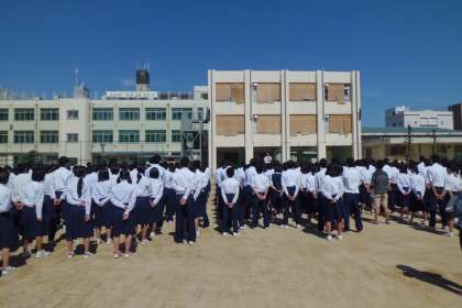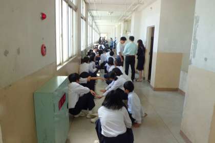3限目は、津波訓練として、1年は本館3階、2年は西館4階、3年は西館3階にそれぞれクラスごとに移動する訓練を、そのあと各教室に戻り、さらに地震を想定し、運動場に避難する訓練を実施しました。
