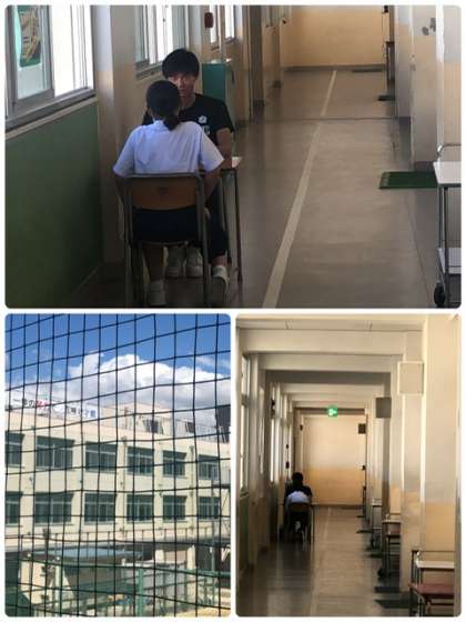教育相談期間です。担任の先生と1年生廊下にて一人ずつ話をしています。