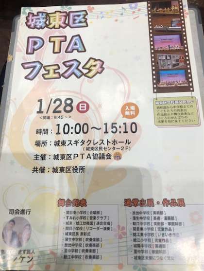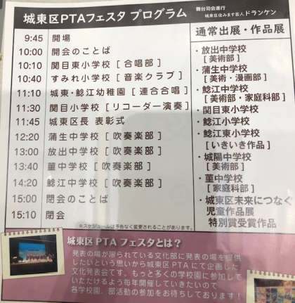 本校より美術部、家庭科部の作品展示および吹奏楽部による演奏(14時20分予定)があります。