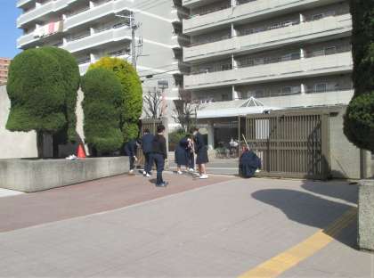 正門 ピロティ付近の清掃です。