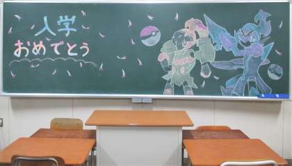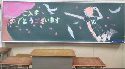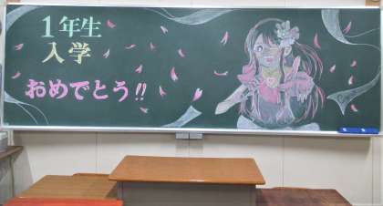 入学式、各学級にあった板書は美術部の作成でした。