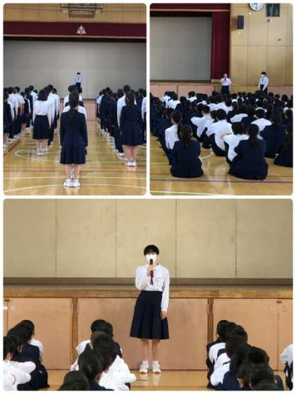 「修学旅行実施まであと1か月を切りました。また、来週からもバスの座席決めなど取り組みが進みますが、みんなが楽しめるような修学旅行になるよう、クラスの仲間と協力してグループ分けなどに取り組んでください。」