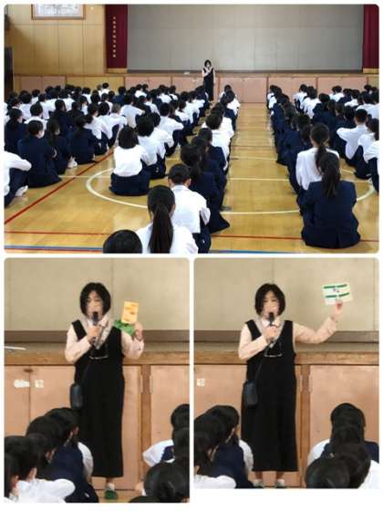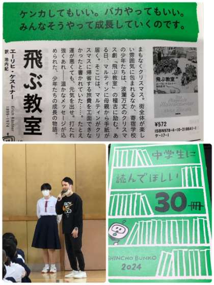 昨日、『中学生に読んでほしい30冊』(参考までに『高校生に読んでほしい50冊』もあります)というパンフレットをもらったと思いますが、絵本などでも小さい頃に読んだ時と今や大人になった時に読んだ時のその本の感じ方や印象は変わることがあります。図書館に30冊を購入、準備しましたので読みに来てください。また、中学生におすすめの本も図書室入って右側のコーナーにたくさんあるので見に来てください。