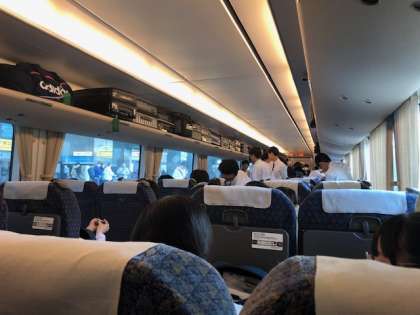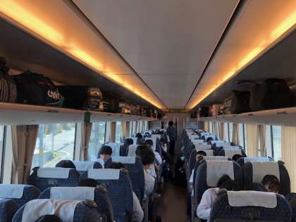 停車中に座席を向かい合わせにしたり、写真撮影をしています。