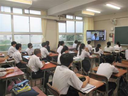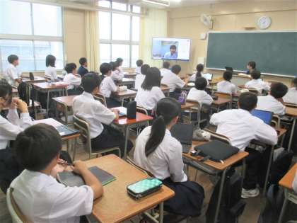 雨天のため、リモートで全校集会を行いました。