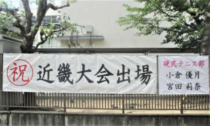 女子硬式テニス部 近畿大会出場の横断幕を正門横に設置しています。