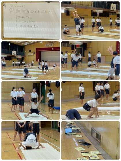 各グループに分かれて、今日発表する技の練習を行っています。各自、自分で技の選択(5種類)をし、みんなの前で発表します。