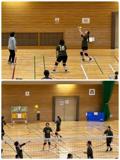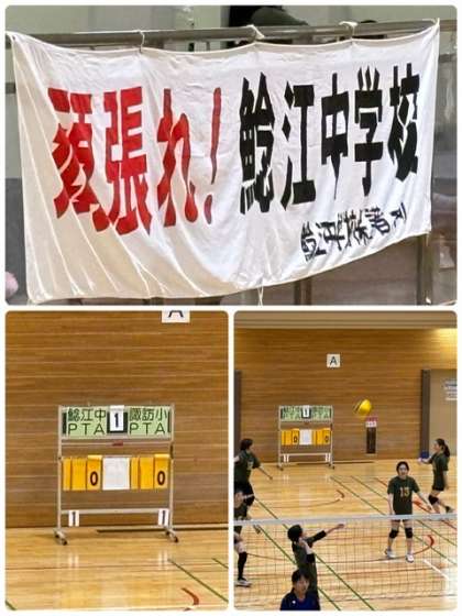 鯰江中PTAバレーボールチームは午前中の1試合目を勝利し、次戦にむけてアップ中です。藤田先生、久保先生も出場しています。