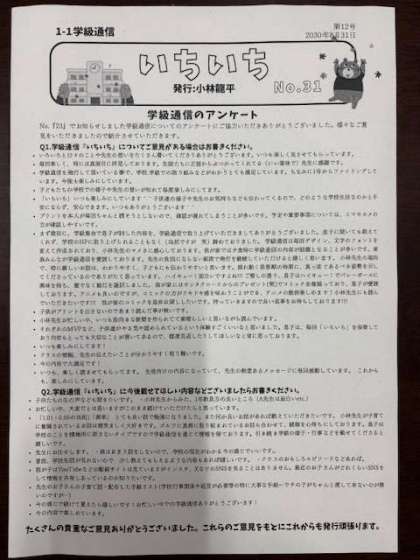 ・学級通信を発行していただいていることで、学校、学級での取り組みなどが分かりやすくとても満足しています。ちなみに1号からファイリングしています。今後も楽しみにしています。