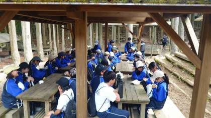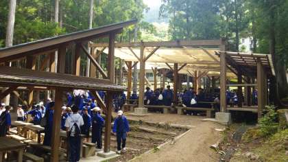 野外炊事の場所で説明を聞いて、いよいよカレーライスづくりです。