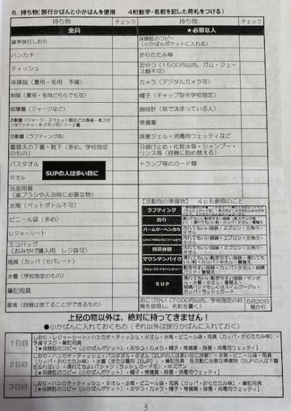 持ち物1つずつ点検していきます。忘れ物なさそうですね。