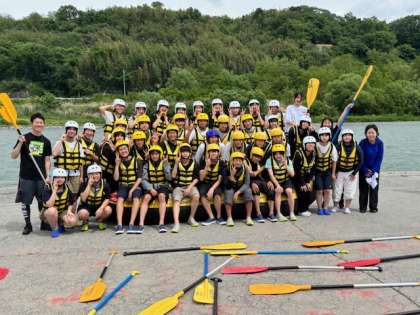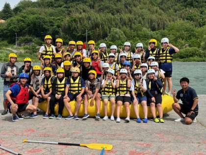 ラフティング会場、川の前で集合写真撮影。