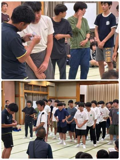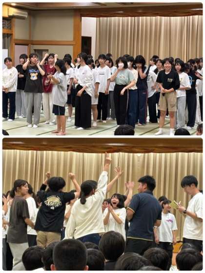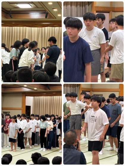 前の人の背中に指で文字を書いて、前の人、前の人へと出されたお題を伝言していきます。