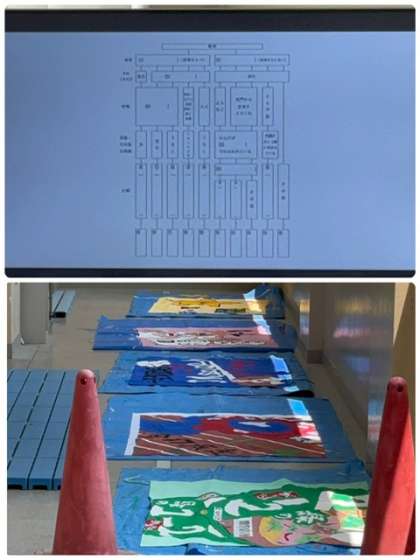 1年生の廊下奥には各クラスの学級旗が塗料が乾くようにほされていました。