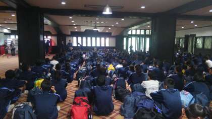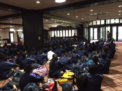 おつかれさま!白馬EXアドベンチャー活動はどうでしたか。みんなが楽しく活動している姿が印象的でした。さて、ホテルに到着。写真は入館式のようすです。この後の活動は、夕食(バイキング)、そして熱気球に乗って白馬の大自然と夜景を堪能します。