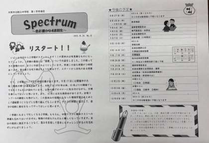 さて、2学期はたくさんの学校行事があります。9月17日には開催中の大阪・関西万博への遠足があります。大阪では1970年以来、55年ぶりの開催でとてもたくさんの人が訪れています。公共の場でのマネーに気を付けながら、万博を楽しんでほしいと思います。また、10月には文化発表会があります。合唱コンクールの練習にも熱が入り、この夏休みの宿題にもなった環境学習のまとめとして壁新聞づくりなどにも取り組んでもらいます。クラスの仲間と協力して、自分の役割に責任をもってやってほしいと思います。