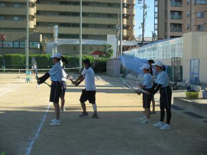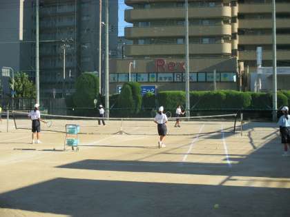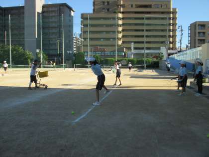 学年別に分かれて、練習しています。1年生は松田コーチ(部活動指導員さん)より基本技術を教えていただいています。テニス部員は暑さに負けません。