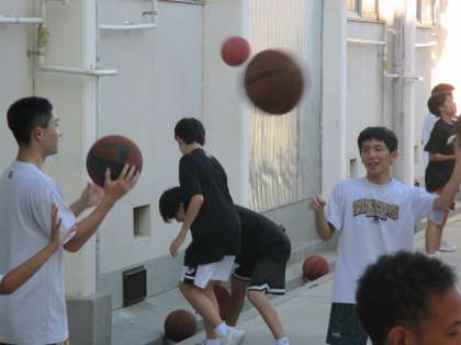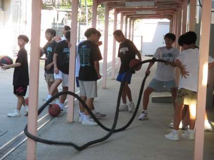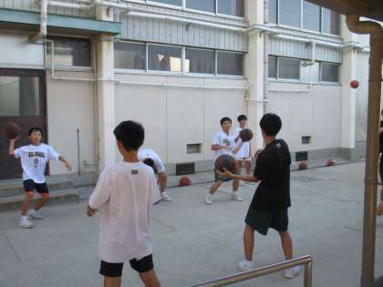 体育館での練習時刻まで体育館横のスペースで練習して待機しています。