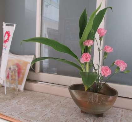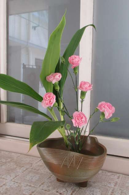 愛らしいピンクのカーネーションと笹の葉による生け花。