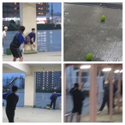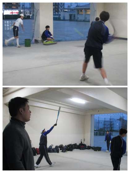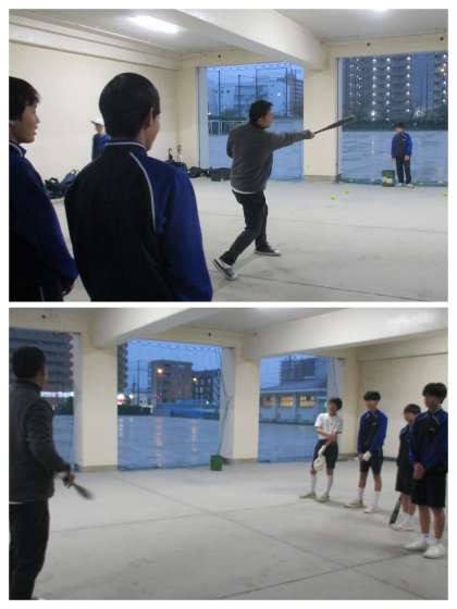野球部はピロティにてバッティング練習です。森先生が直接スイングをお手本で見せて指導していました。