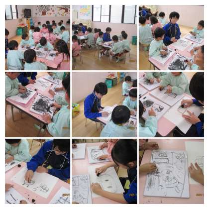 園で育てたサツマイモを収穫し、焼きいもをした時に出た炭を使って、お絵かきをしていました。みんな、ちからいっぱいに描いて、中学生のお兄さん、お姉さんも手をまっ黒にしてがんばっていました。