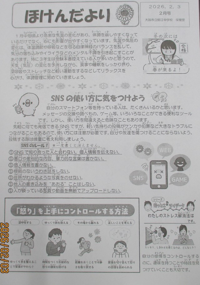 ほけんだより2月号(2026.2.3発行、鯰江中学校保健室より)一部抜粋